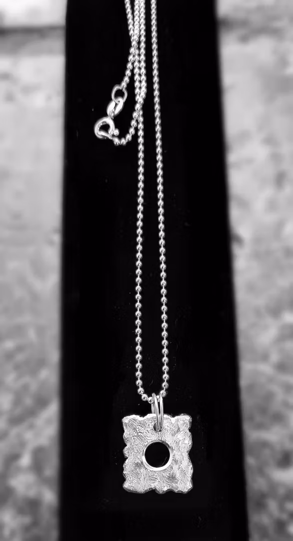 Silverhänge med kulhalsband. En halvblank yta och ojämna kanter som skapar en vacker och dramatisk helhet. Det cirkulära hålet i mitten av smycket tillför ytterligare en dimension. Smycket är tillverkat i 925 sterlingsilver och varje hänge är unikt skulpterat.